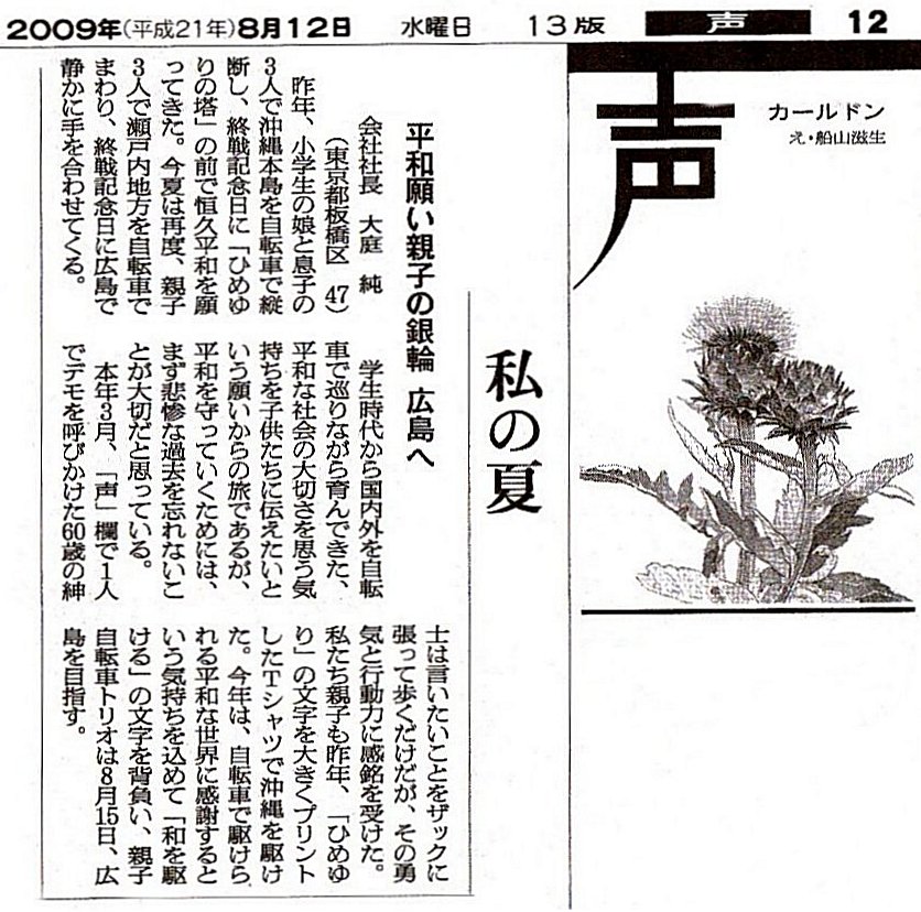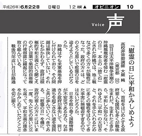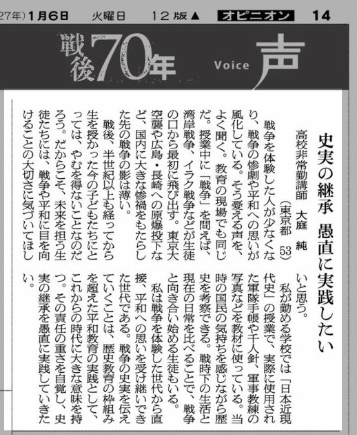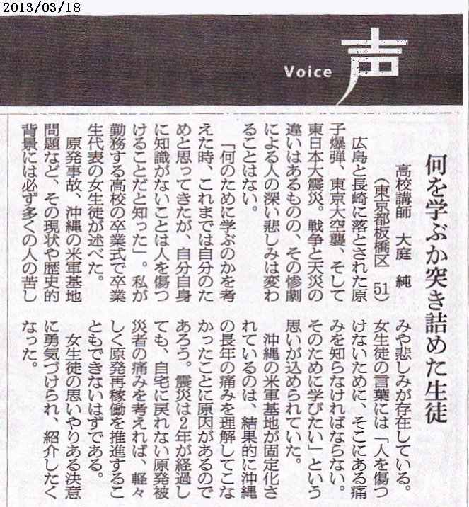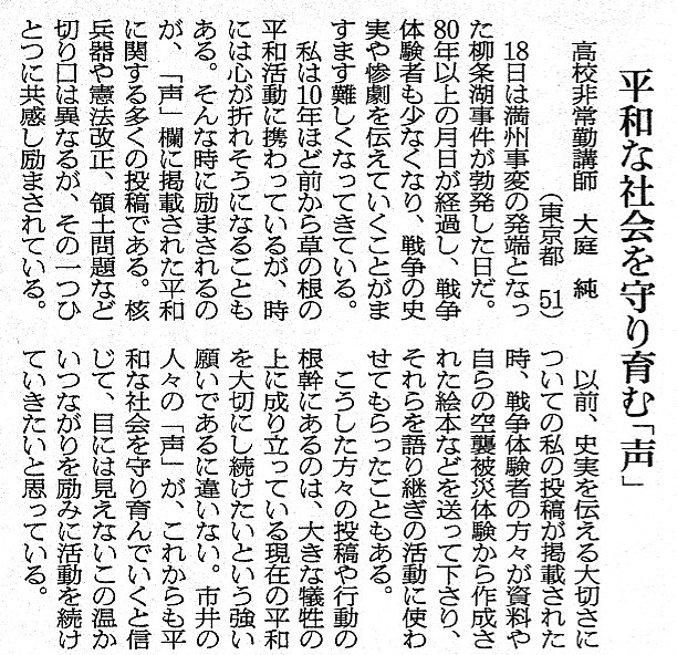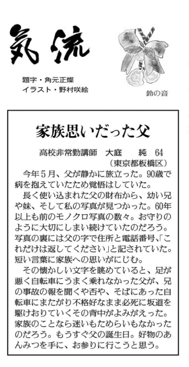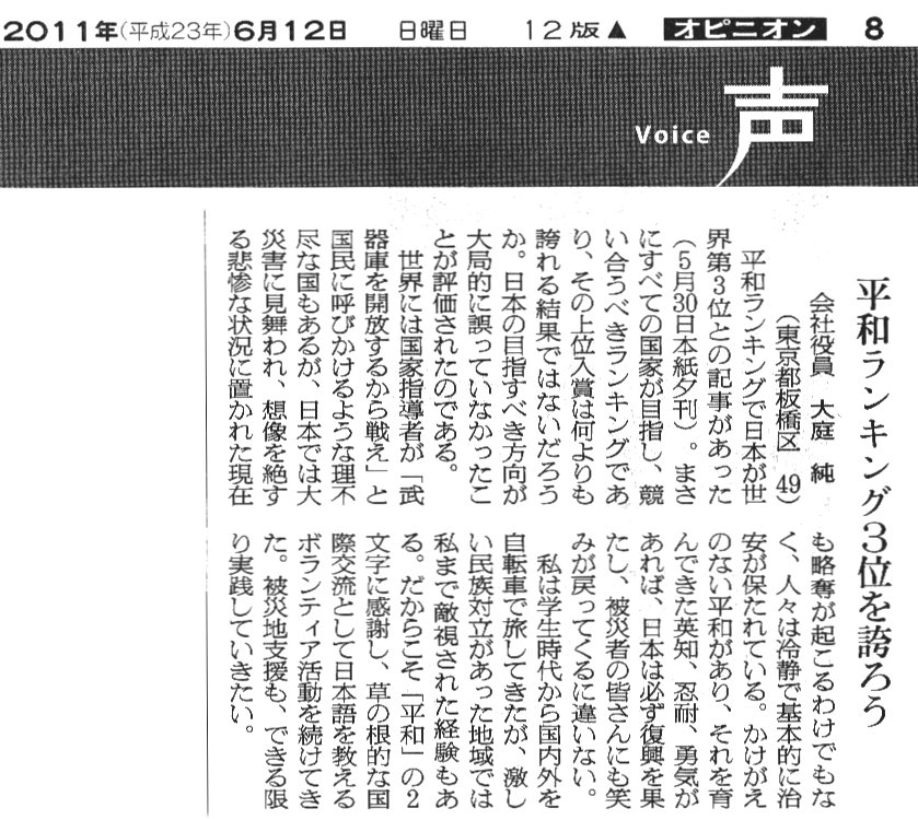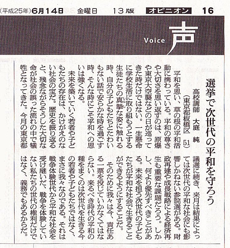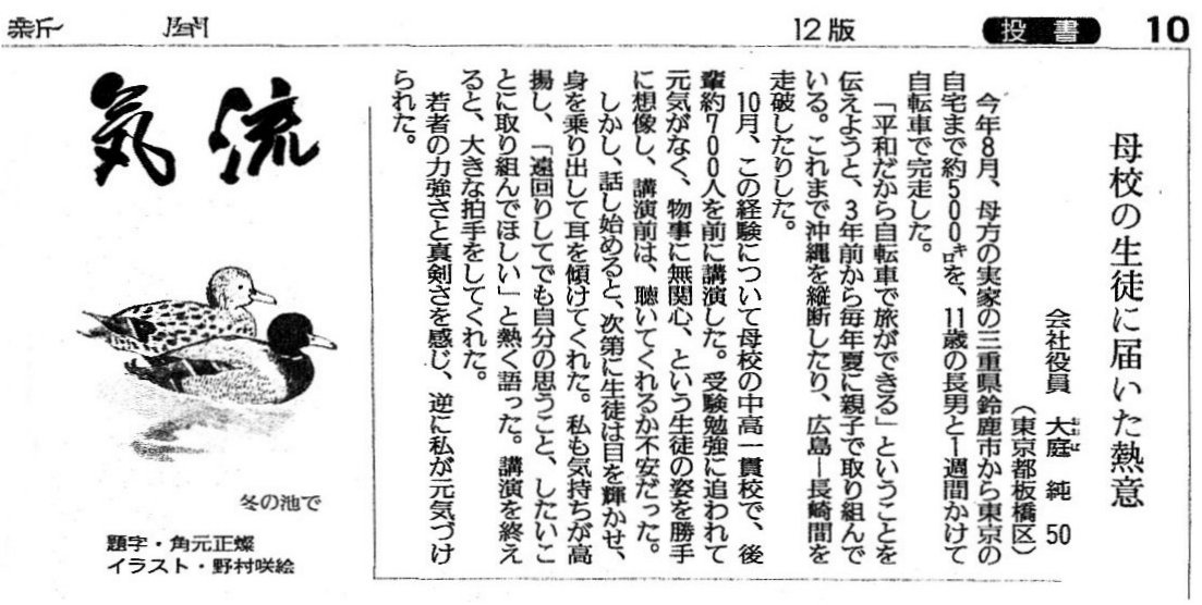 ※ その時々の思いを投稿してみました。 宜しければお読みください。 (不鮮明な部分もありますがご了承ください。) 2025年12月3日 讀賣新聞 2025年9月29日 朝日新聞 2025年6月30日 東京新聞 ![]() 2025年4月4日 朝日新聞 2024年11月12日 読売新聞 ![]() 2024年10月3日 毎日新聞 2024年2月19日 東京新聞 2023年2月28日 朝日新聞 ![]() 2022年8月2日 朝日新聞 ![]() 2021年3月26日 朝日新聞 ![]() 2020年4月4日 読売新聞 ![]() 2019年8月30日 朝日新聞 ![]() 2016年6月27日 朝日新聞 ![]() 2015年7月4日 朝日新聞 2015年1月6日 朝日新聞 ![]() 2014年6月22日 朝日新聞 ![]() 2014年3月9日 朝日新聞 ![]() 2013年9月19日 朝日新聞 ![]() ![]() 2013年6月14日 朝日新聞 ![]() 2013年3月18日 朝日新聞 ![]() 2012年12月9日 朝日新聞 ![]() 2012年 朝日新聞 ![]() 2012年6月25日 朝日新聞 ![]() 2012年 読売新聞 ![]() 2011年6月12日 朝日新聞 ![]() 2009年8月12日 朝日新聞 ![]() 2008年12月31日 朝日新聞 ![]() 2007年 朝日新聞 ![]() 2006年11月7日 朝日新聞 ![]() 2002年6月23日 朝日新聞 ![]()